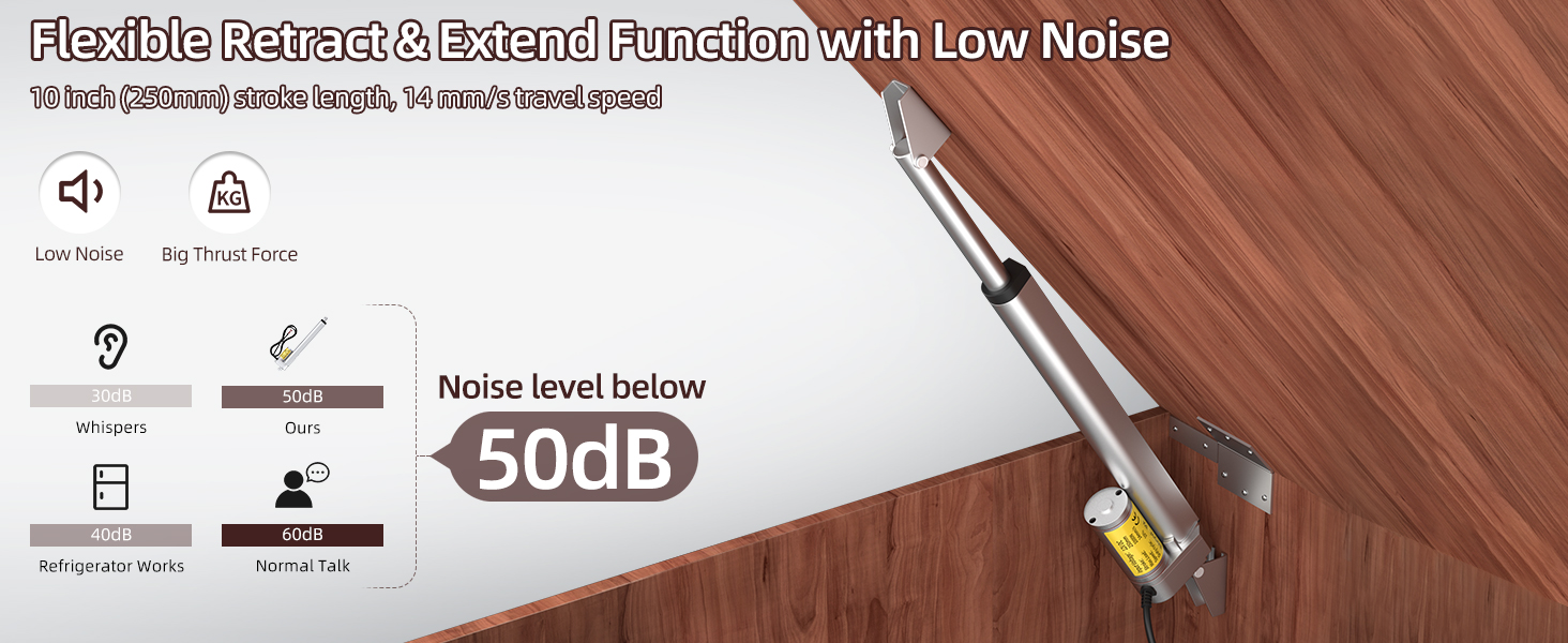 Engineered for smooth performance, the actuator operates efficiently with a noise level kept below 50dB, ideal for applications where reduced sound output is preferred.