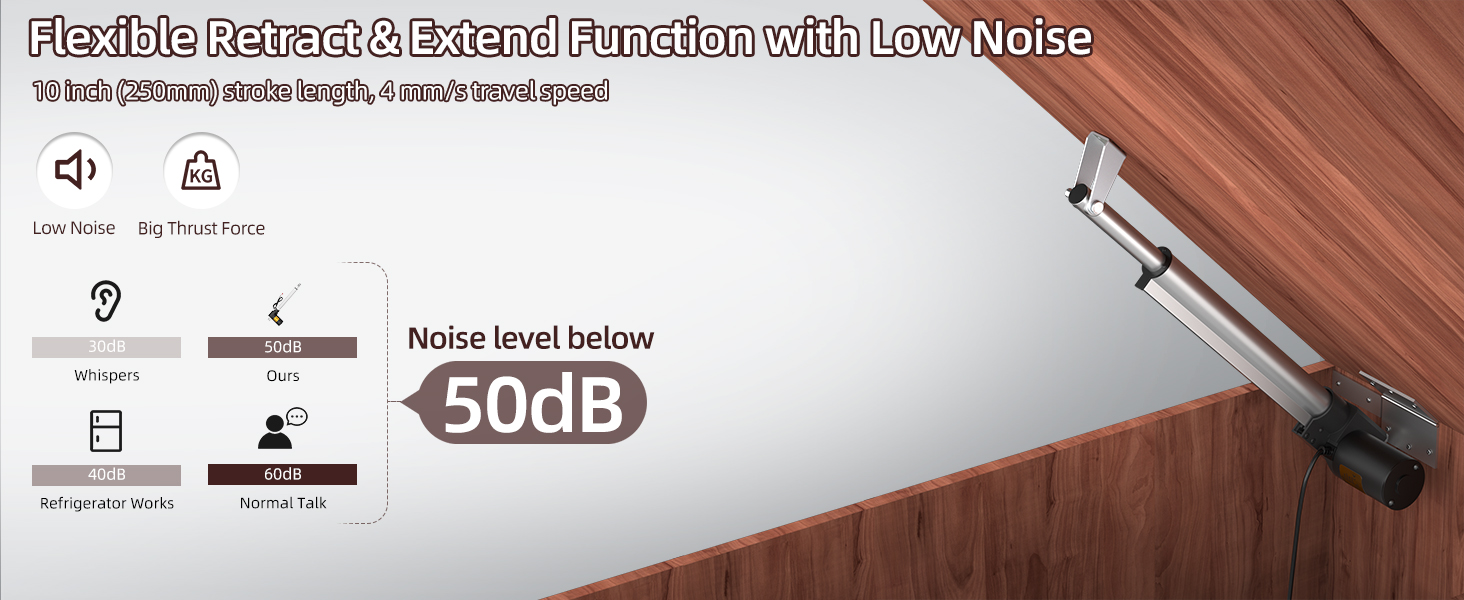 Engineered for smooth performance, the actuator operates efficiently with a noise level kept below 50dB, ideal for applications where reduced sound output is preferred.