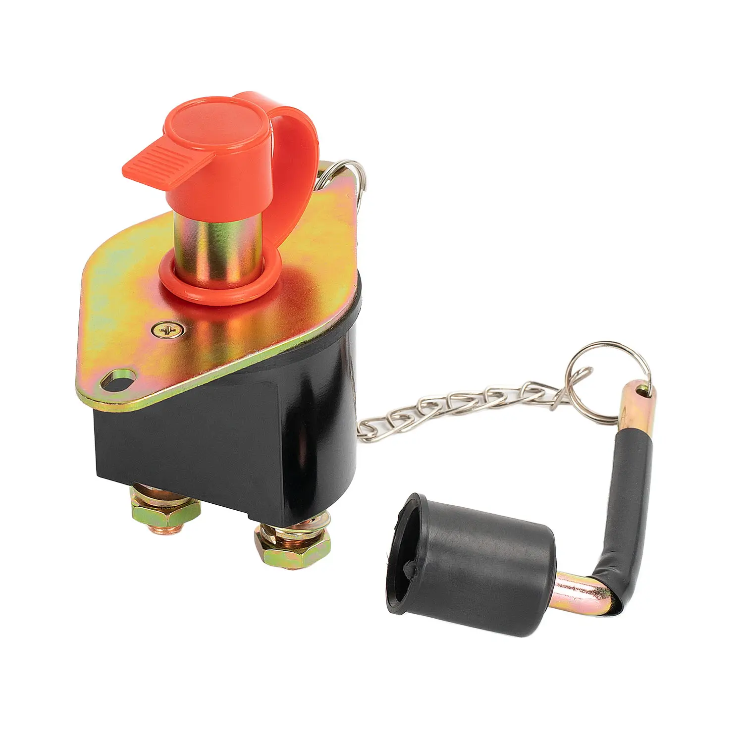 The battery kill switch is constructed with a zinc-plated steel housing for superior durability and corrosion resistance. This power cutoff switch features two heavy-duty copper terminal studs for excellent electrical conductivity and secure cable connections. The all-metal design ensures long-term reliability in harsh operating environments.
