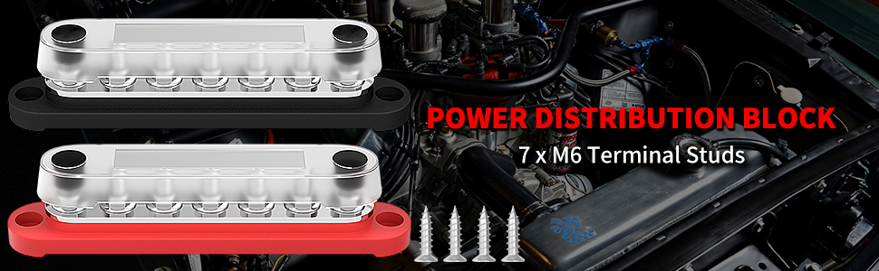 The marine battery distribution block is rated for 150A DC continuous current in 12-48V DC, with 7×M6(1/4″) studs.