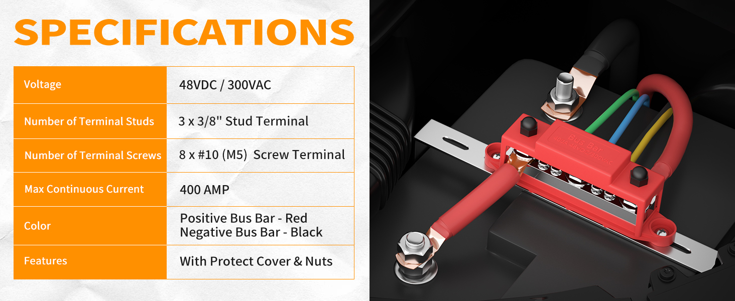 This bus bar terminal block features an 8mm (0.32″) thick copper bus bar plate for superior conductivity and corrosion resistance. Stainless steel studs, nuts, and a high-quality nylon base provide long-lasting durability and reliable performance. The included red positive and black negative bus bars provide clear visual identification for safe wiring.