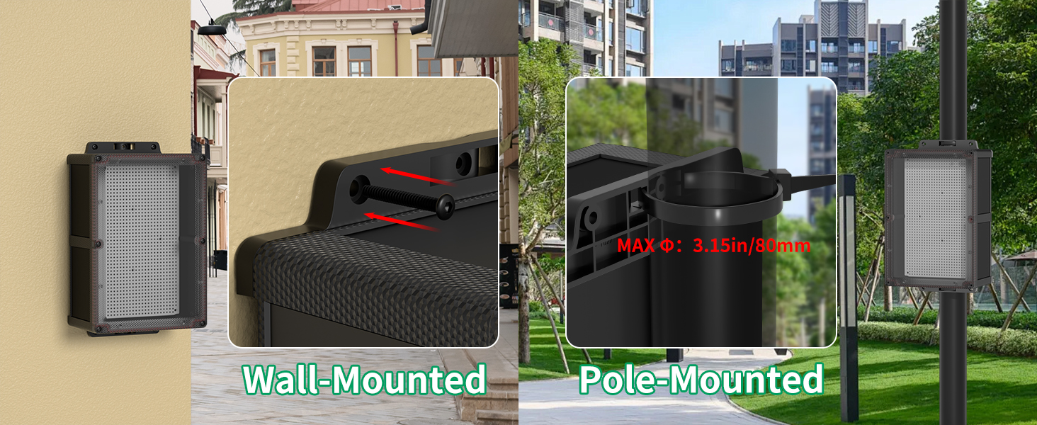 This junction box kit offers flexible installation options. It can be easily mounted on walls, poles (up to 3.15 inches in diameter), or other suitable surfaces using the included mounting hardware. Multiple mounting holes and screws are provided for secure attachment.