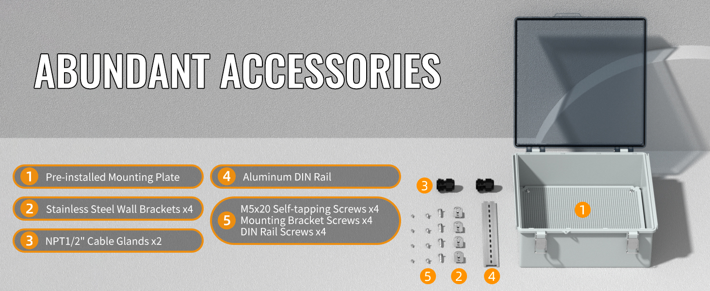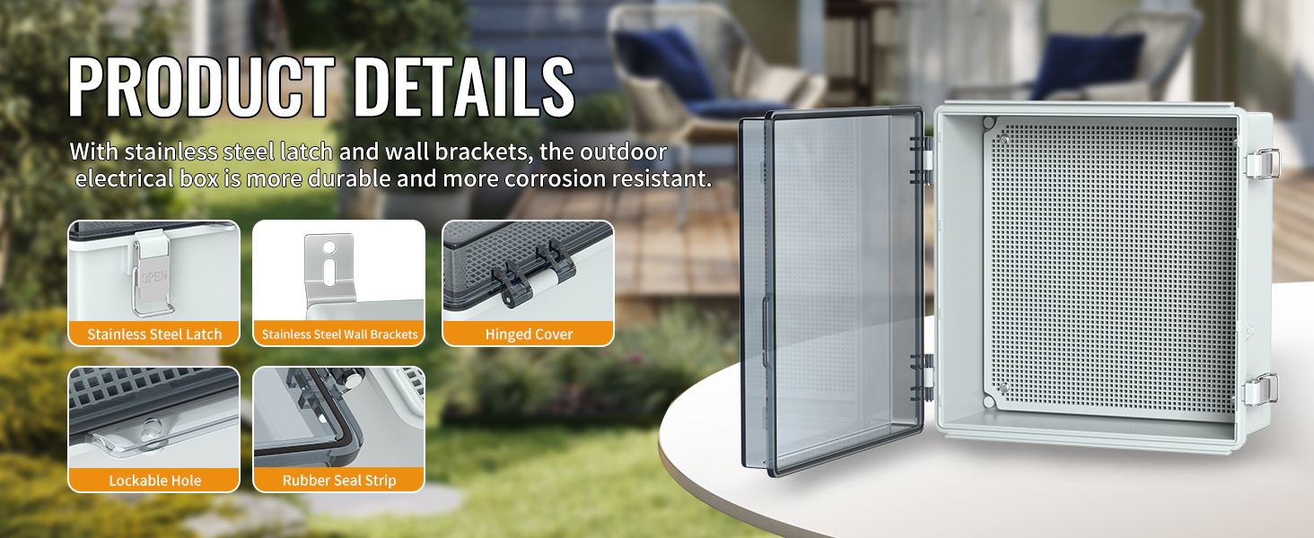 The weatherproof plastic box comes equipped with a sturdy 304 stainless steel latch. Stainless steel wall brackets provide a secure and reliable mounting system. These features ensure easy access to the interior while maintaining a weatherproof seal.