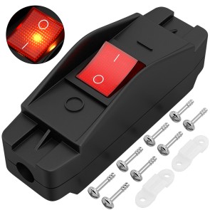 The inline cord switch is a 30A 250V/ 30A 120 VAC DPST 4-pin on-off rocker switch with red led illuminated.