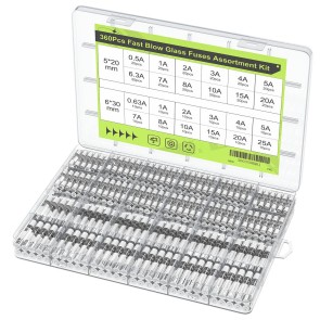The fast-blow glass fuses assortment kit with 360pcs fuses, including 12 types for both 5x20mm and 6x30mm fuses, and rating from 0.5A to 25A.