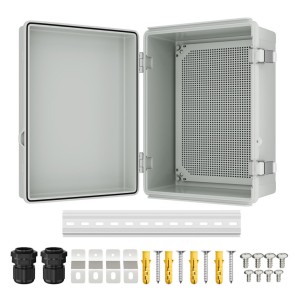 The outdoor plastic electrical box kit with a hinged cover measures 11.4"x7.5"x5.5" is easy to install and can be used in various electronic devices.