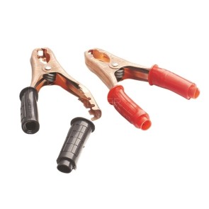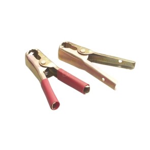 WD032 alligator clamps are made of solid copper for low electrical resistance, and are used with thick insulated copper cables to make connections between automobile batteries.