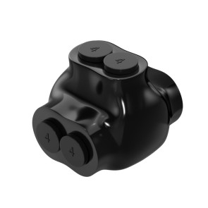 The 2/0-6AWG Black multi-tap 2-port pre-Insulated connector secure connections between multiple conductors with a rounded design and UV-resistant insulation coating