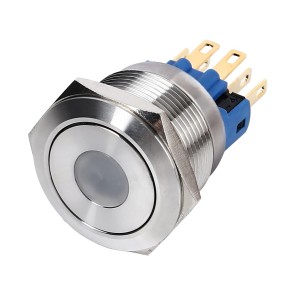 The 30mm push button with ring illuminated, function: SPDT, 6 Pins, 1NO+1NC, momentary/latching; contact rating: 3A 250V AC; RoHS certification.