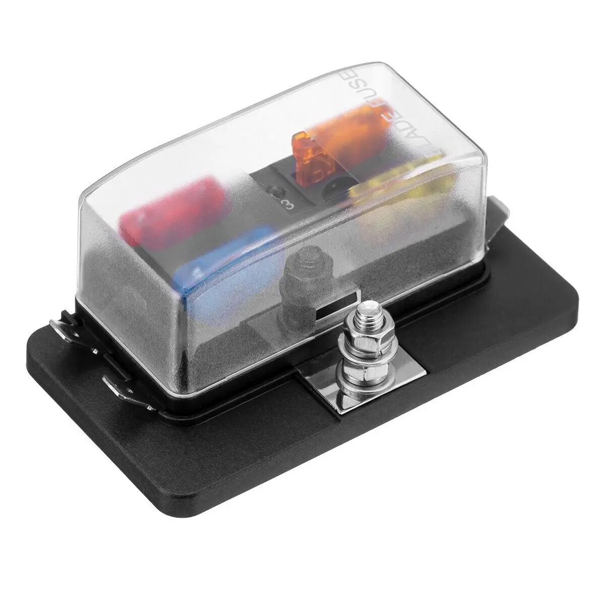 This 12V/24V ATO/ATC standard 4-way blade fuse block offers enhanced protection with its transparent cover, guarding against dust and moisture.