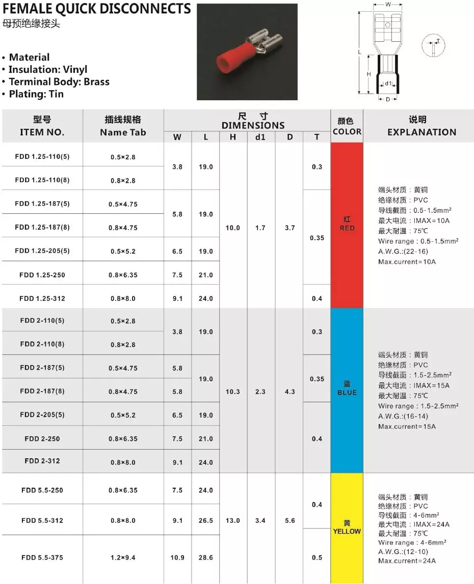 FDD Female quick disconnects and their matching male counterparts accommodate a vast AWG, and are available in fully-insulated, non-insulated, and partially-insulated options. Wire ranges include yellow in 12-10 AWG, blue in 16-14, and red in 22-18 with convenient packages of 100 or 1000. Female disconnect terminal types include vinyl, nylon, heat shrink, and high temperature materials. Choose from non-insulated, barrel insulated, and fully-insulated quick disconnects offered in a variety of tab widths, including .110 inch, .187 inch, and .250 inch options to meet your specific application needs. The unique construction of these safe and reliable female quick disconnect terminals provide an ease-of-use and long-term dependability that you can always count on!
