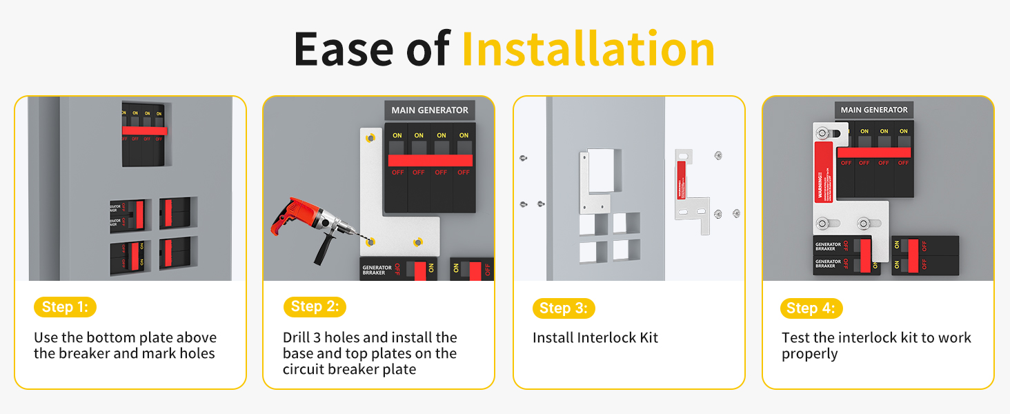 This interlock kit features a 1-1/4 inch (1.25″) spacing between the main breaker and generator breaker slots. This precise spacing design ensures that the main breaker and generator breaker cannot be ON simultaneously, preventing dangerous backfeeding and ensuring a safe electrical system, a critical safety feature.