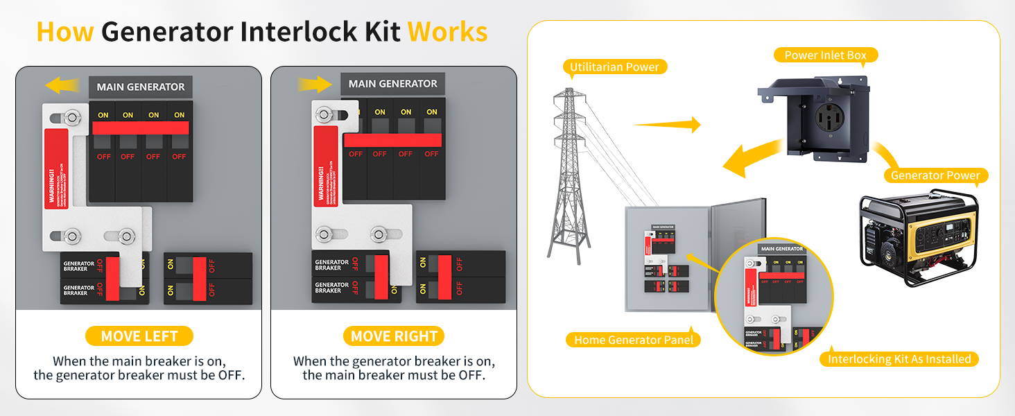 Engineered for safety and reliability, this interlock kit provides a critical safety function by preventing the simultaneous energizing of main utility power and backup generator power, ensuring code-compliant operation during outages.