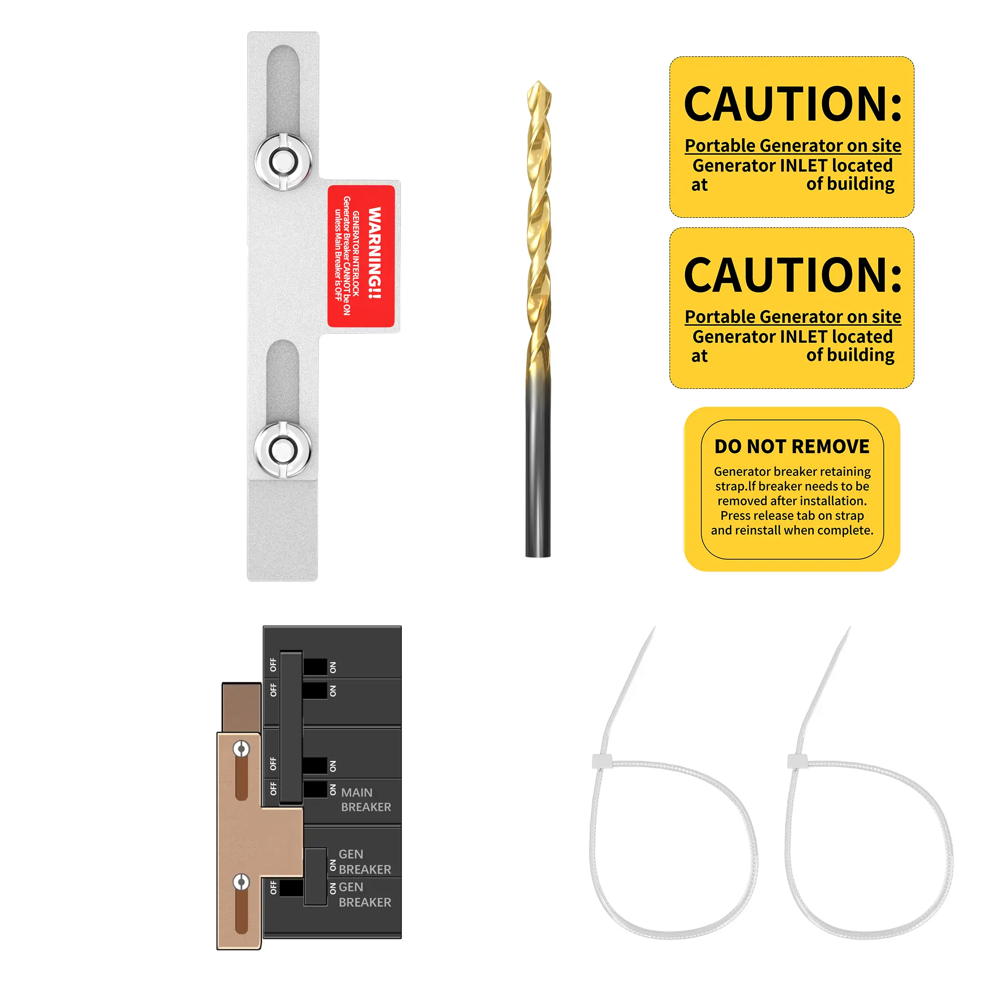 The generator interlock kit includes all necessary components for safe and easy generator connection: Two interlock plates, three generator reminder labels, the drill bit, mounting screws and nuts, zip ties for wire management, and detailed installation instructions for a safe, code-compliant generator hook-up.
