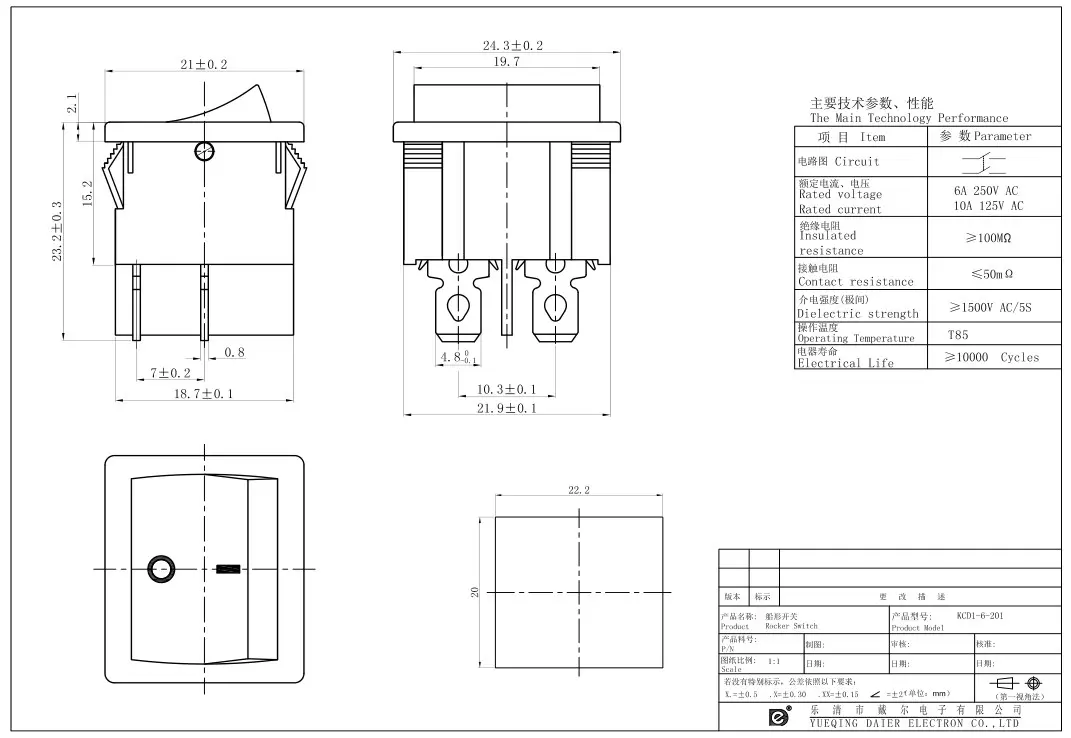Daier KCD1-6-201 on off miniature dpst rocker switch offer a high switching current in a compact design.