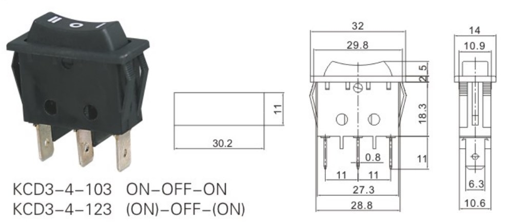 KCD3-4-103/123 Latching/Momentary 3 Position SPDT Rocker Switch Information