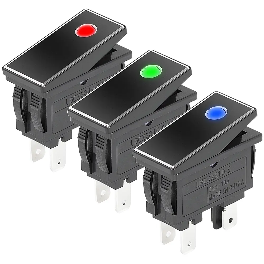 This IP65 waterproof 2NO 4-pin square 16A LED metal rocker switch features an easy-to-install safety catch and sturdy silver-plated pins.