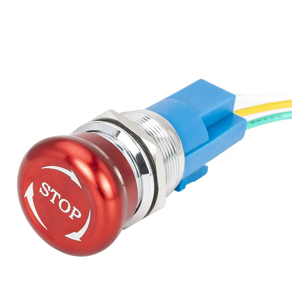 The mushroom emergency stop push button switch is structured compactly and operated quickly and gently.