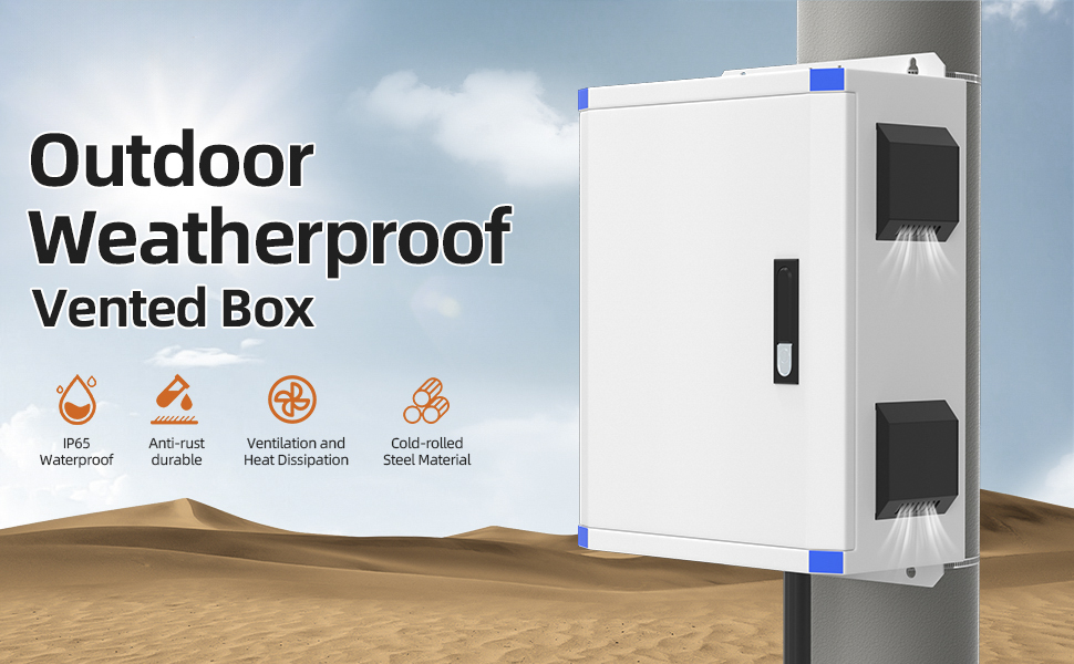 This 19.7″x15.7″x7.9″ IP65 waterproof outdoor electrical enclosure is constructed from durable cold-rolled steel and features a 12V cooling fan for efficient thermal management.