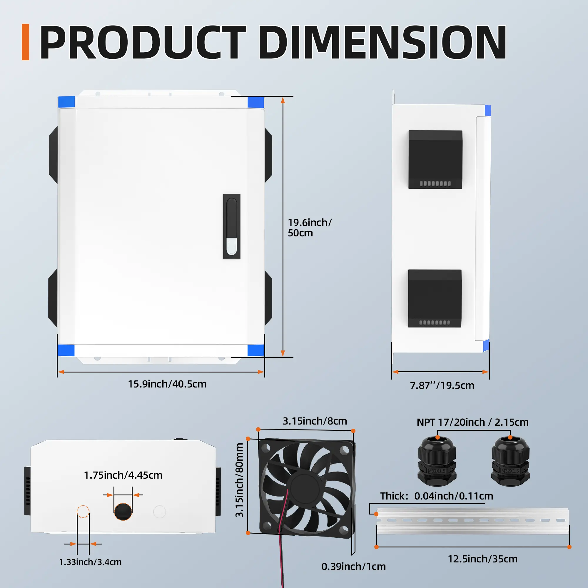 This 19.7″x15.7″x7.9″ IP65 waterproof outdoor electrical enclosure is constructed from durable cold-rolled steel and features a 12V cooling fan for efficient thermal management.