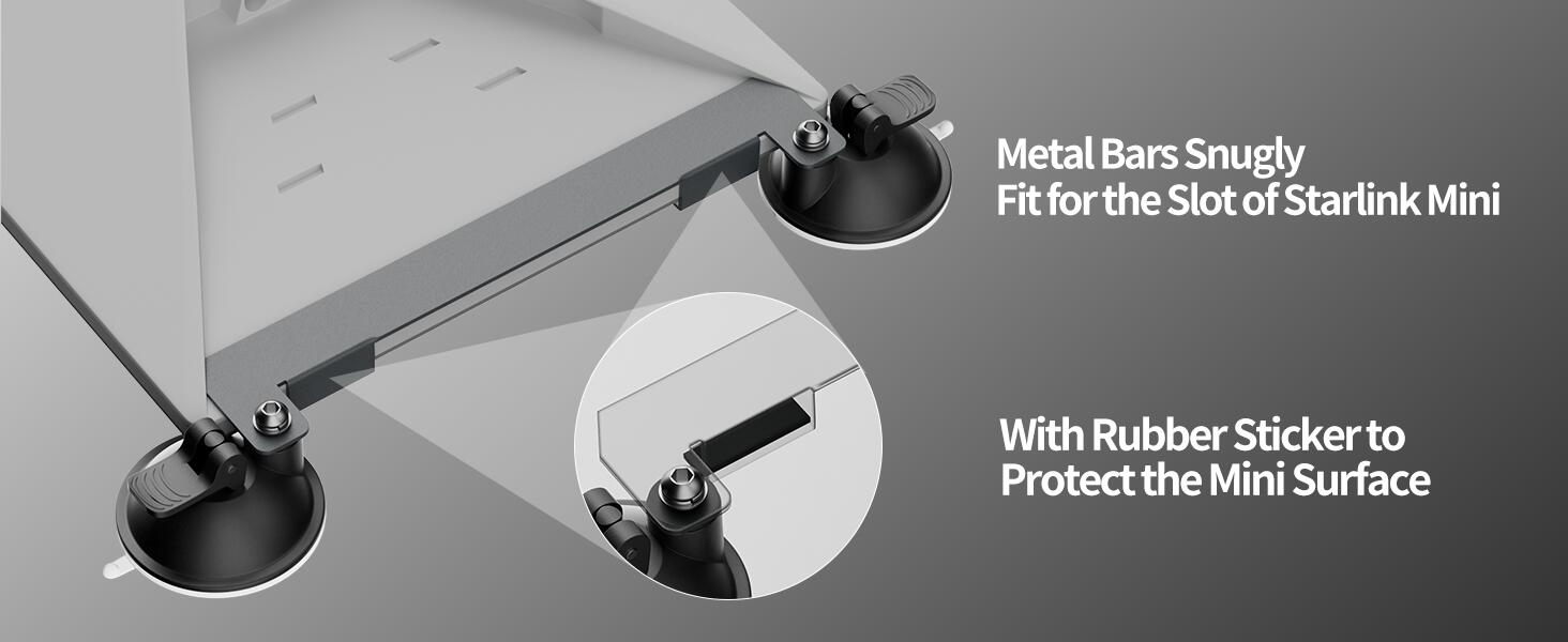This Starlink Mini mount is crafted from Iron with a rust-resistant paint finish for enhanced durability and long-lasting performance. The metal bars provide a robust frame, while the sticky suction cups ensure a secure grip on smooth surfaces. Rubber stickers on the metal bars offer additional padding and protection for your Starlink Mini.