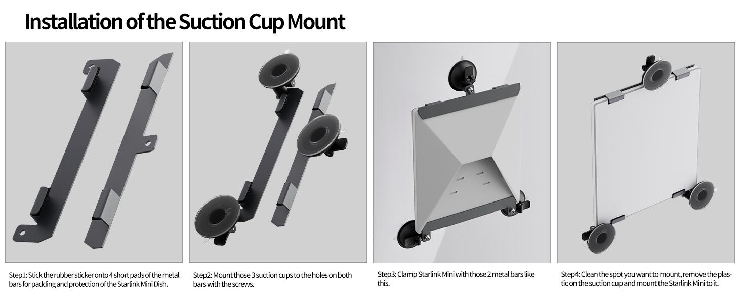 This mount kit is designed for straightforward installation and removal. Simply clean the mounting surface, attach the suction cups, clamp the metal bars onto your Starlink Mini, and secure them with the included screws. The suction cups can be easily released for quick removal of the mount when not in use.