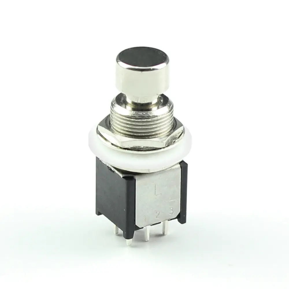 These are the sturdy little stomp switches that you find on guitar effects pedals. They’re DPDT on-(on) type switches which mount into a 12mm diameter hole.