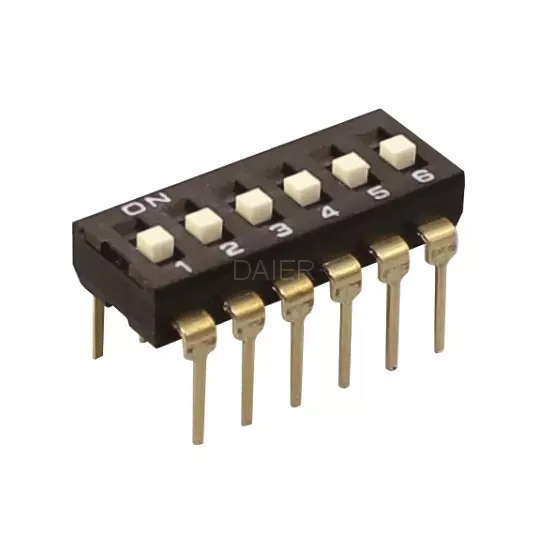 Daier series of surface mount half-pitch DIP switches, low profile and standard profile DIP switches, rotary and coded DIP switches, coded rotary DIP switches, SIP switches and jumper switches feature a variety of extended actuator and flush actuator styles. Daier DIP switches are available in surface mount, through-hole, right angle and vertical mounting options.