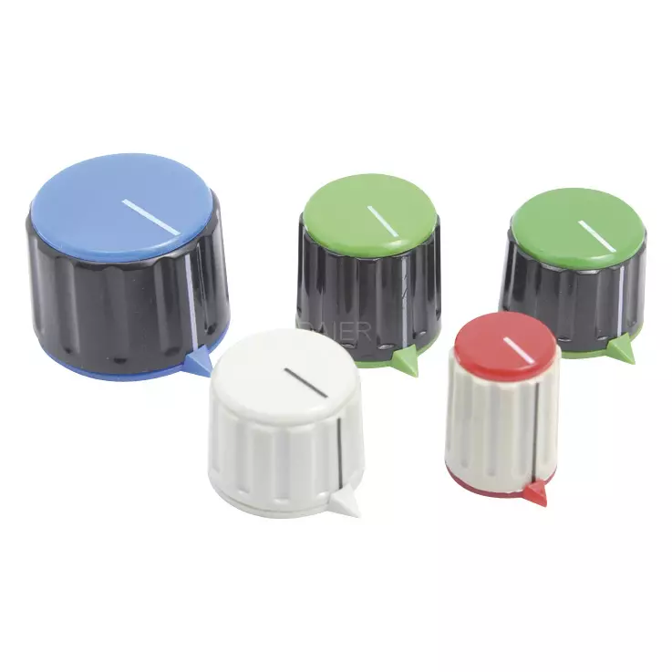 KN116 plastic switch knob with colorful top and housing.  Have a small arrowhead indicator on housing.