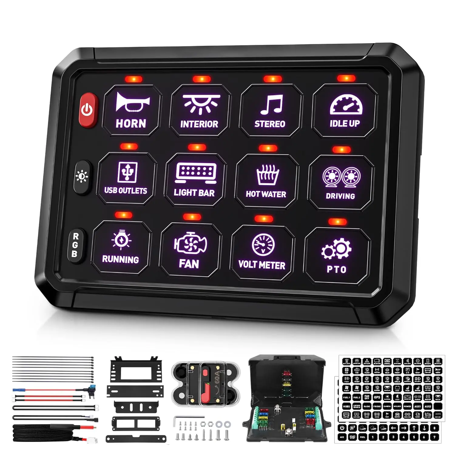 Each of the 12 switches on this programmable switch panel can be individually set to one of three control modes: Constant Light (standard on/off), Momentary (press and hold), or Strobe (flashing). This multi-function relay box provides tailored control for diverse accessories like horns, warning lights, or winches. The system also remembers your last setting thanks to its integrated memory function.