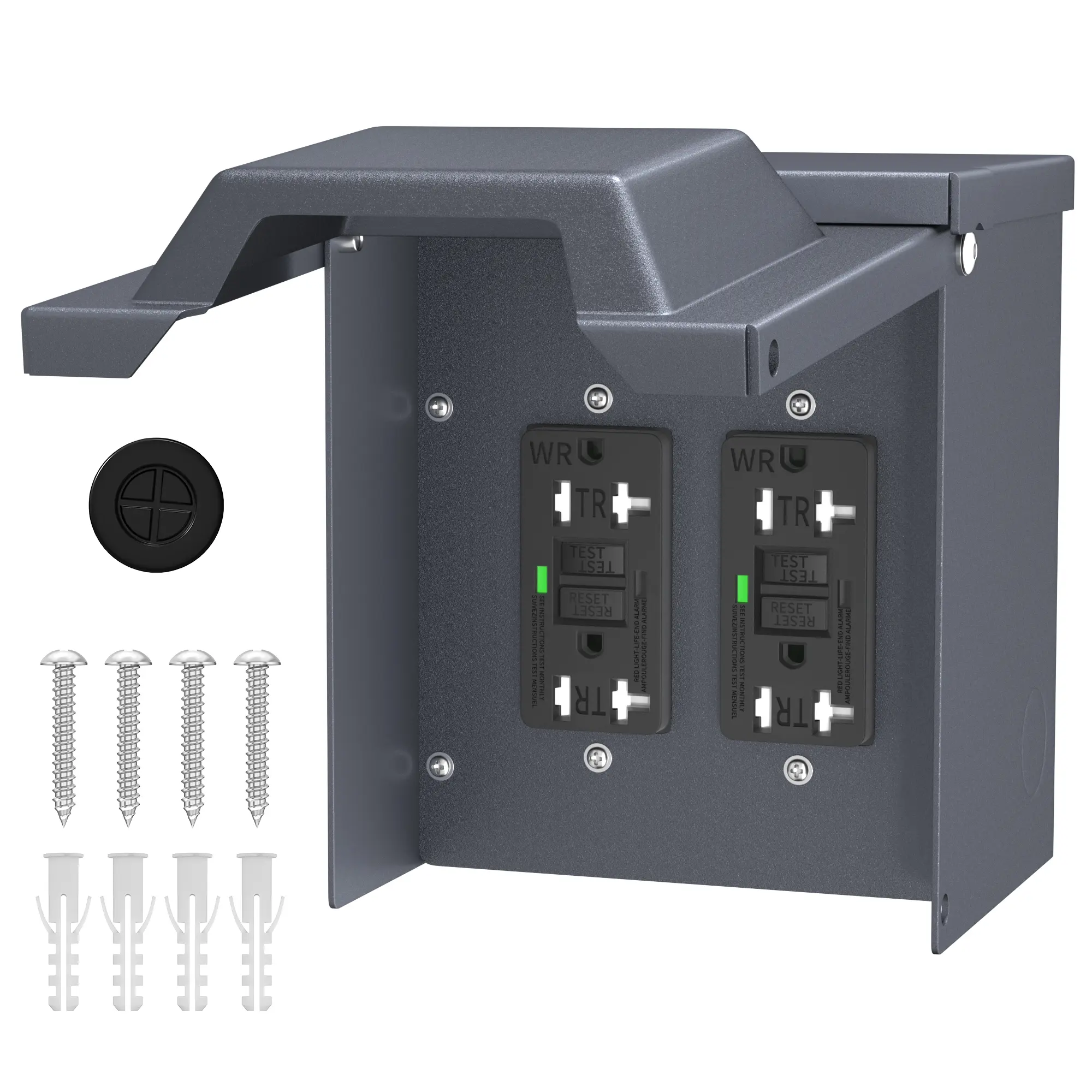 This GFCI outlet box is built to withstand the elements. The galvanized steel housing with a corrosion-resistant finish provides excellent protection against rust, rain, and UV damage. The weatherproof, self-closing hinged cover stays securely in place and allows for easy access to the receptacles while protecting them from the elements.