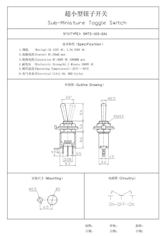 Sub-mini Toggle SwitchSMTS-103-2A1 Single Pole Toggle Switch: